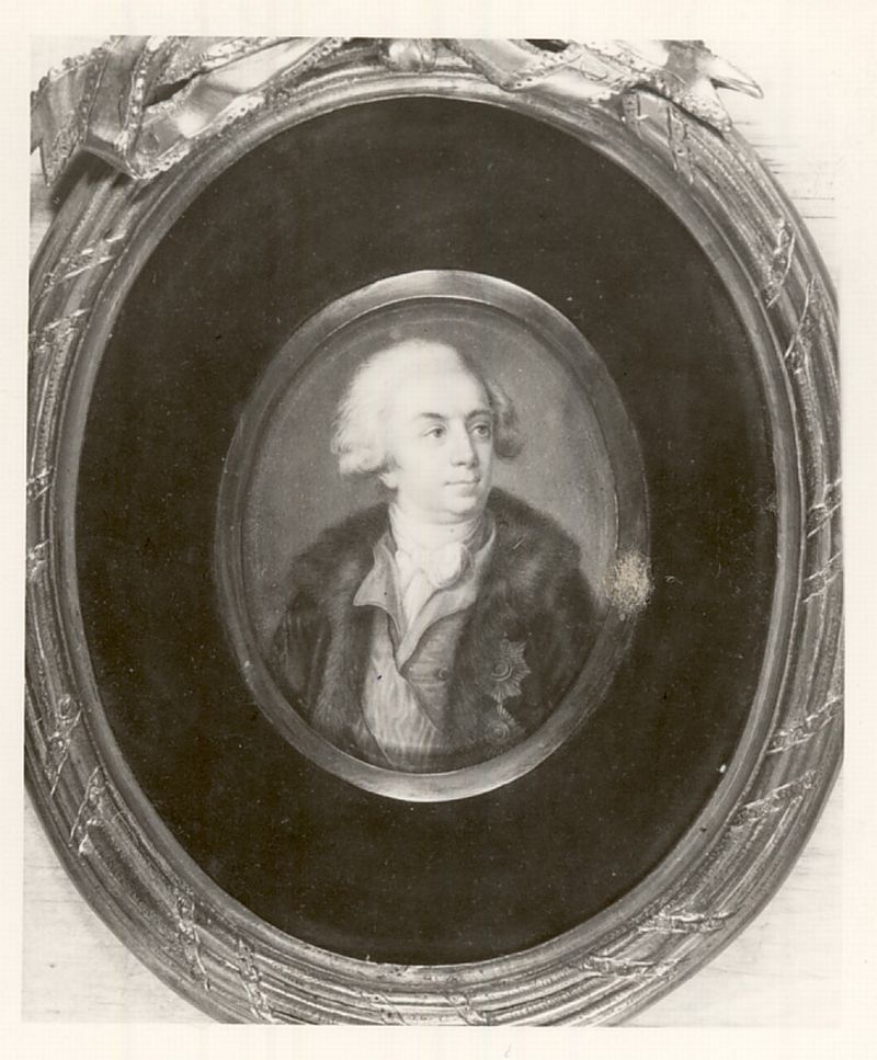 Kék kabátban, vörös ruhában, fehér nyakmasnival ábrázolt parókás férfi szembenülő, jobbranéző derékképe, szürkészöld háttér előtt. Bal oldalán két éremrend látható. |